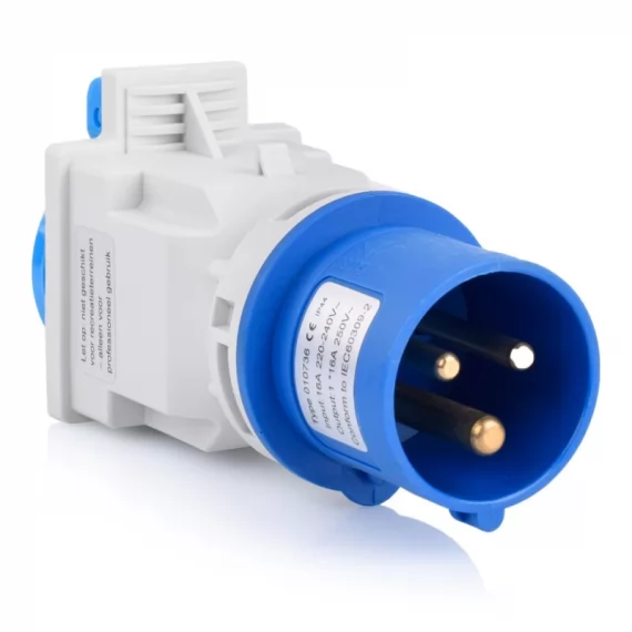 Αντάπτορας συμπαγής που αποτελείται από ένα αρσενικό φις τύπου CEE 16Α (17-0230) και από μία θηλυκή πρίζα σούκο με καπάκι.