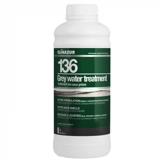 Το 136 Καθαριστικό Grey water treatment είναι ένα συμπυκνωμένο υγρό σκεύασμα που περιέχει μείγμα μικροοργανισμών, για την χρήση στο σύστημα συλλογής υδάτων από νιπτήρες και ντουζιέρες. Διαλύει υπολείματα λαδιού, ζωικού και φυτικού λίπους και η τακτική προληπτική χρήση βοηθάει στην εξάλειψη των δυσάρεστων οσμών.