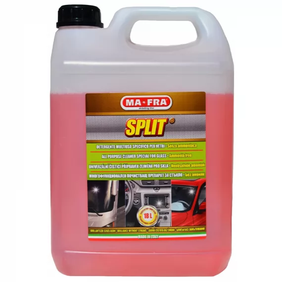 Καθαριστικό τζαμιών χωρίς αμμωνία Split της Ma-Fra. Η ισορροπημένη φόρμουλα αλκοόλης και φυτικών συστατικών δημιουργεί έναν ενεργό αφρό ικανό να αφαιρέσει γρήγορα κάθε είδος ρύπου ή γράσα. Το προϊόν αφαιρεί κάπνα και τα υπολείμματά της από τα παράθυρα, τους καθρέπτες, πλαστικά και όλες τις πλενόμενες επιφάνειες, αφήνοντας ένα ευχάριστο άρωμα υγιεινής και δίνοντας λάμψη χωρίς να αφήνει κηλίδες.