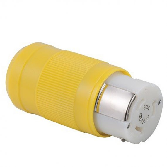 Φις 50Α με θηλυκές υποδοχές σκέτο. Συμβατό με τάσεις 125V και 250V, διαθέτει και μία επιπλέον θέση σύνδεσης καλωδίου για την χρήση σε τάση 250V.