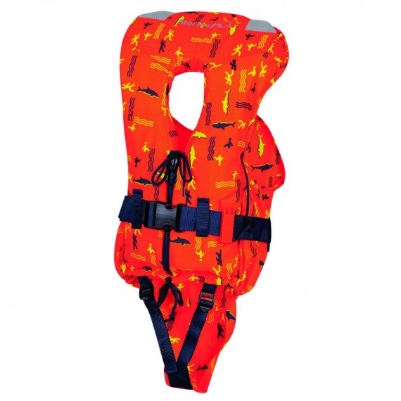 Certified life jacket with reflective tapes, whistle and securing/fastening straps. Equipped with retrieve handle attached to the collar. The collar is specially designed to wrap the child’s neck for maximum support Brings the user to a supine position effortlessly, feature vital in case the user was unconscious when went overboard or due to age has limited body control. Zipper closure and adjustable belt with plastic buckle with additional crotch support strap. Available in vivid bright colors.